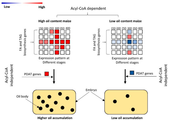 Proposed model for oil accumulation in maize embryo. Two pathways are highlighted in this model. Fatty acyl-CoA dependent pathway is the main pathway for triacylglycerols (TAG) biosynthesis and upregulation of genes encoding enzymes involved in this pathway lead to higher oil accumulation in maize embryos, and vice versa. Fatty acyl-CoA independent pathway is an alternate pathway for TAG biosynthesis. Higher expression of genes encoding PDAT enzyme contributed to higher oil accumulation.