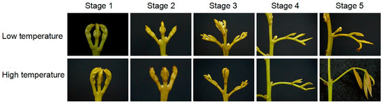 The phenotype of five developmental stages of panicle leaves in litchi trees subjected to low or high temperatures. Litchi trees were transferred to a growth chamber at 18 °C as low temperature treatment to induce panicle leaf senescence when panicle primordia emerged. The other trees were transferred to a growth chamber at 26 °C as high temperature to encourage panicle leaf development. The growth of the panicle leaves was divided into 5 stages.