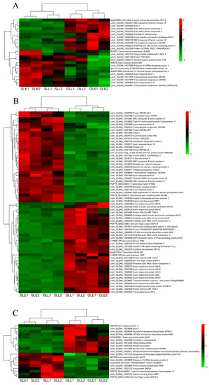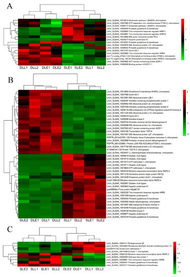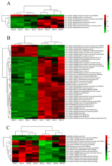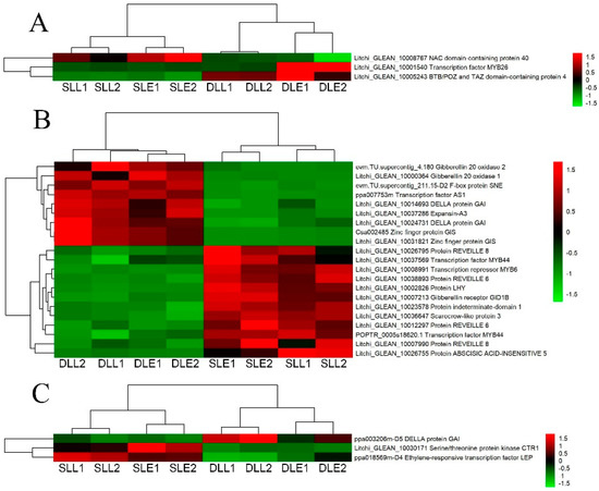 Heat map diagram showing the GA-related differentially expressed genes (DEGs) between senescing and developing panicle leaves. (A) The unique DEGs expressed at an early stage. (B) The DEGs simultaneously expressed at early and later stages. (C) The unique DEGs expressed at a later stage. Litchi trees were transferred to a growth chamber at 18 °C to induce panicle leaf senescence when panicle primordia emerged. The other trees were transferred to a growth chamber at 26 °C to encourage panicle leaf development. FPKM values of the samples were normalized to Z-score.