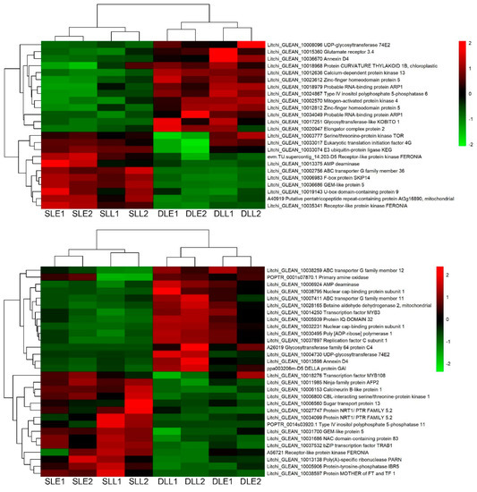Leaf senescence is the final stage of leaf development [6,7]. The process may occur automatically in mature leaves as age-dependent senescence [8]. Also, leaves may be induced to senesce before maturity when they are exposed to drought, and high and low temperatures [9,10,11]. The litchi panicle leaf senescence induced by low temperature, ROS, and NO is regarded as premature leaf senescence [3,12,13]. In our previous studies, we have figured out the feature of the low temperature-induced senescence of panicle leaves, and found that programmed cell death (PCD) is involved in the senescence induced by low temperatures in litchi [3,12]. We then determine the expression profiles of PCD-related genes during the low temperature-induced senescence [12]. However, the expression patterns of other genes during low temperature-induced senescence in litchi panicle leaves are not known. It has been demonstrated that leaf senescence is controlled by hormonal signaling regulatory gene networks. Abscisic acid (ABA), ethylene, jasmonic acid (JA), and salicylic acid (SA) signaling pathways can speed up senescence in older leaves [14,15], while cytokinin (CTK), gibberellic acid (GA), and auxin (IAA) delay the onset of senescence [8]. It has also been shown that transcription factors NAC, WRKY, and MYB are central players in modulating transcriptional changes under hormonal control [16,17]. Understanding how low temperature affects hormone-related gene expression and their central players is the critical clue for panicle leaf control.