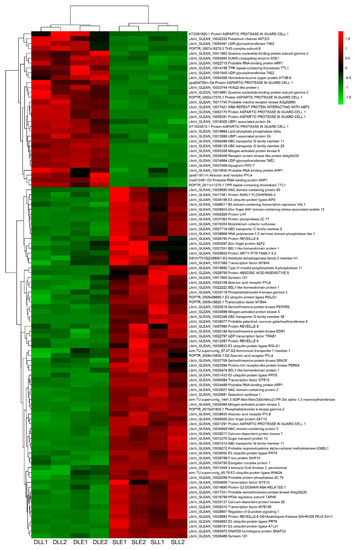 Figure 3 shows the ethylene-related DEGs. Eight genes at an early stage and 3 genes at a later stage were only differentially expressed between the senescing and developing panicle leaves. Twenty-one DEGs were simultaneously expressed at the two stages. Interestingly, from developing leaves to sensing leaves, 51 out of 68 of the DEGs were upregulated, such as the ethylene receptor 2, protein EIN4, ethylene-responsive transcription factor 1B, ethylene-responsive transcription factor 9, ethylene-responsive transcription factor RAP2-3, and MYB44 encoding genes.