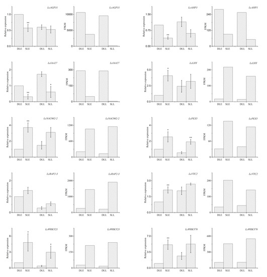 Expression of the 10 candidate differentially expressed genes determined by quantitative real-time PCR (qRT-PCR) and RNA-sequencing (RNA-Seq). Single asterisk indicates significant difference between developing leaves and senescing leaves at 0.05 probability level. Double asterisks indicate significant difference between developing leaves and senescing leaves at 0.01 probability level.