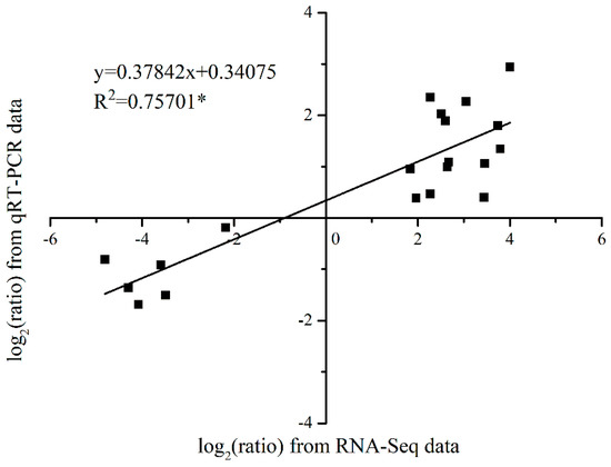 To confirm our RNA-Seq data, we selected 10 plant hormone-related DEGs and determined their relative expression using qRT-PCR. The results showed that their expression trends as determined by qRT-PCR were similar to those revealed by RNA-Seq, and a significantly positive correlation between the obtained data from qRT-PCR and RNA-Seq was found, confirming the reliability of our RNA-Seq data. Our studies provided potential genes for the future molecular breeding of new cultivars that can induce panicle leaf senescence and reduce floral abortion under warm climates.