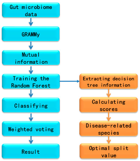 Most existing models perform classification based on OTU and MLG data and have shown some success in diagnosing cancer. Of the existing classification models, the random forest classifier typically had a superior area under the curve (AUC) score. It also showed better generalizability and robustness [23], making it suitable for use with high-dimensional data. In this paper, mutual information [24,25] is introduced to remove species that are weakly associated with CRC. As a result, the quality of input data is better, thereby improving random forest classifier’s accuracy. We also extracted decision tree data from the random forest and identified the microbes that were the best predictors of the disease, thus providing a new tool for screening CRC.