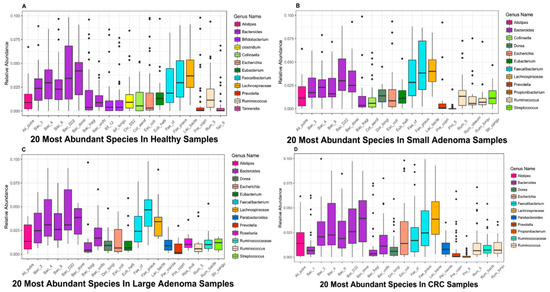 Top 20 microbial species with high relative abundance in samples of different disease stages. (A) The relative abundances of the top 20 microbes in the healthy samples. (B) The relative abundances of the top 20 microbes in small adenoma patients. (C) The relative abundances of the top 20 microbes in large adenoma patients. (D) The relative abundances of the top 20 microbes in colorectal cancer patients. The horizontal axis represents the abbreviation of the corresponding names of microbial species, the vertical axis represents the relative abundance of the corresponding microbes, and the different colored bars in the box plot indicate different microbial genera in Figure 3A–D.