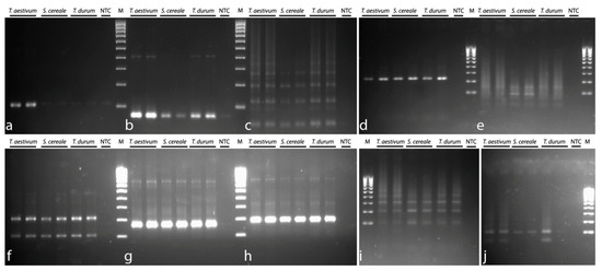 Electrophoresis of primers for monomers: (a) P170, (b) P317, (c) P332, (d) P720, (e) P496, (f) P431, (g) P525, (h) P631, (i) P497, and (j) P699. M—size standard (100 bp DNA ladder).