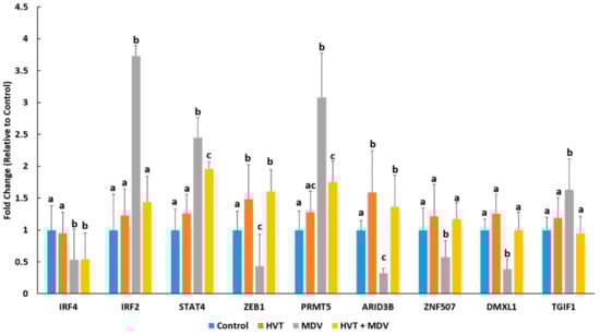 The splenic expression profile transcriptional regulators identified in yeast one-hybrid screenings of the chicken promoters of miR-30d and miR-10b. Expression was determined in control (mock-infected) birds (n = 4), HVT-vaccinated birds (n = 4), MDV-infected birds (n = 4), and birds vaccinated with HVT and subsequently infected with MDV (n = 4) at 42 dpi using RT-qPCR. Error bars denote standard deviations. Differing letters denote statistical significance (p < 0.05). For each gene, treatment groups with differing letters had a statistically significant difference (p < 0.05), while groups with the same letter were not significantly different (p > 0.05).