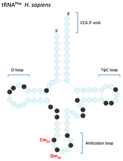 Representation of the mature human tRNAPhe (76 nucleotides). The two Nm modifications in the anticodon loop, in C32 and G34, are placed by the 2′-O-methyltransferase FTSJ1 and are annotated in red. Blue circles are for non-modified nucleotides, black circles mean modified nucleotides (adapted from http://modomics.genesilico.pl/).
