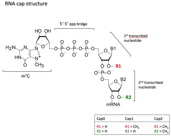RNA cap structure: The cap0 structure consists of a guanosine residue, methylated in the N-7 position, which is bound to the terminal 5′-end nucleotide of the mRNA with a 5′-5′ triphosphate bridge. Subsequent 2′-O-methylation in the ribose of the first, or both the first and the second, transcribed mRNA nucleotides leads to the formation of cap1 or cap2, respectively. This figure has been adapted from Reference [151].