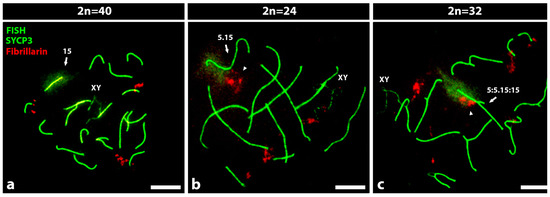 - Berríos, S.; Manieu, C.; López-Fenner, J.; Ayarza, E.; Page, J.; González, M.; Manterola, M.; Fernández-Donoso, R. Robertsonian chromosomes and the nuclear architecture of mouse meiotic prophase spermatocytes. Biol. Res. 2014, 47, 16–29. [Google Scholar] [CrossRef] [PubMed]