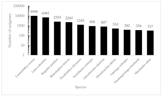 Among all the predictable unigenes, a total of 34,104 unigenes (46.07%) were searched against multiple databases, while 39,931 (53.93%) unigenes had no BLASTx hits. Among all the annotated unigenes, 33,244 unigenes matched against the NR database (97.48%) and 28,924 against Swiss-Prot (84.81%) (Table 2). These annotated unigenes provided the basis for further study on specific molecular processes in S. sihama. This may be related to the limited genomic information available for members of the Sillaginidae, or because these unannotated unigenes were specific sequences containing unknown protein domains, genes’ untranslated regions, or non-coding RNAs [23]. Based on the NR database, a total of 33,244 unigenes matched known sequences from 688 different species. Most unigene matches were to Larimichthys crocea (30.07%), Lates calcarifer (21.00%), Stegastes partitus (7.69%), Rhinolophus sinicus (6.80%) and Paralichthys olivaceus (3.75%) (Figure 1), for which genomic information is available.