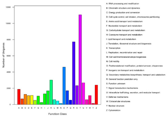 Clusters of KOG function classifications of all annotated unigenes in S. sihama gonadal transcriptome. Each function class is represented by a capital letter under the horizontal axis. The vertical axis denotes the number of unigenes in the corresponding function class.
