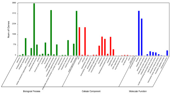 GO annotation was performed to classify the 13,324 DEGs (Figure 5). At the biological process level, the GO terms “cellular process” (1476 unigenes), “single-organism process” (1335 unigenes) and “metabolic process” (1131 unigenes) included more DEGs. There are also more DEGs in the GO terms “binding” (1218 unigenes) and “catalytic activity” (965 unigenes) at the molecular functional level. At the cellular component level, more DEGs were seen in the GO terms “cell” (668 unigenes), “cell part” (668 unigenes), and “membrance” (639 unigenes). GO enrichment analysis showed that 106, 10, and 60 GO terms were significantly enriched in the categories “biological process”, “cellular component”, and “molecular function”, respectively (Table S3) (p < 0.05). Meanwhile, 3,323 DEGs were mapped to 217 KEGG pathways, and 27 significant KEGG pathways were obtained (with a threshold of Q value < 0.05, Table S4).