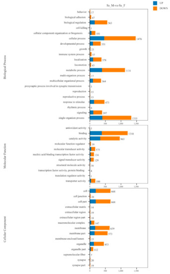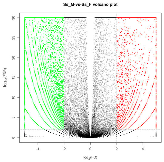 In this study, 35,367 unigenes were found to be DEGs between the male and female (FDR ≤ 0.01 and log2FC ≥ 2) (Figure 4). A total of 13,324 (37.67%) DEGs were annotated, with 9,815 up- and 3,509 down-regulated genes in the male. Many male-biased unigenes and female-biased unigenes were identified in S. sihama, as in gonadal transcriptome analyses of other species [23,27], indicating that reciprocal antagonism between male-promoting and female-promoting pathways is a central feature underlying sexual development and maintenance in vertebrates.