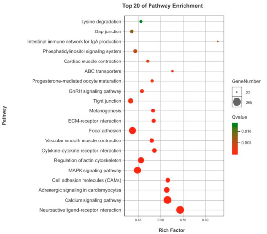 In this study, we identified some enriched KEGG pathways related to silver sillago gonadal development and gametogenesis; i.e., neuroactive ligand-receptor interaction, calcium signaling pathway, adrenergic signaling in cardiomyocytes, cell adhesion molecules, MAPK signaling pathway, progesterone-mediated oocyte maturation, and GnRH signaling pathway (Figure 6).