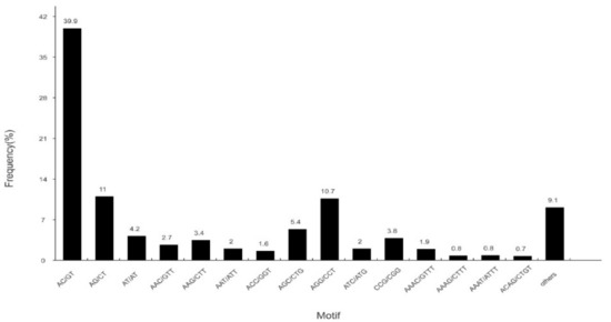 A total of 22,666 SSRs were identified in 14,577 SSR-containing sequences (Figure 7). Most SSR repeats were dinucleotide (12,579, 55.50%), followed by trinucleotide (7317, 32.28%), tetranucleotide (1871, 8.25%), pentanucleotide (500, 2.21%), and hexanucleotide (399, 1.76%). SSRs are important molecular markers that will serve as a valuable resource for parentage analysis, population genetics, and genetic linkage mapping in S. sihama in the future.