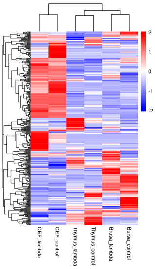 The present study was conducted in accordance with animal ethics guidelines and approval was given by the Beijing Administration Office of Laboratory Animals, China. A total of 60 newly hatched SPF chicks were obtained from Beijing Arbor Acre Company Ltd., P.R. China. Chicks were reared in cages (n = 10 birds/cage) and placed in six cages in a temperature-controlled environment at the Biotechnology Research Institute, Chinese Academy of Agricultural Sciences (CAAS), P.R. China. Birds were offered standard commercial feed obtained from CP Group Ltd., P.R. China. Unrestricted access to water was provided via nipple drinker lines and ad libitum feed was offered. A treatment group of 14-day old chicks were injected daily with chIFN-λ (10,000 IU/kg body weight) (105 IU/mL). Phosphate buffer saline (PBS) was injected intramuscularly to the control group. The bursa of Fabricious and thymus were obtained by euthanizing the chickens at five days post-treatment. Tissue samples were rapidly collected, snap-frozen in liquid nitrogen, and stored at −80 °C for further processing.