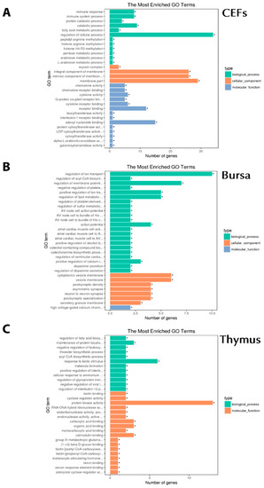 Gene Ontology (GO) analysis associated with chIFN-λ-treated organs. A: chIFN-λ-treated CEF. B: chIFN-λ-treated bursa of Fabricius. C: chIFN-λ-treated thymus.