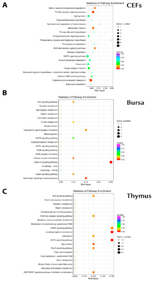 Further to gene ontology and differential expression, we investigated KEGG pathway enrichment. In CEFs, significant enrichment was seen in pathways including the MAPK signaling pathway (FOS/IL1B/FOSB), the toll-like receptor signaling pathway (FOSB, IL8L1, IL1B, FOS, CCL5), influenza A (IL8L1/IL1B/CCL5), cytokine–cytokine receptor interactions (CCL20/IL8L1/IL1B/CX3CR1/CCL5), salmonella infection (FOSB/IL8L1/IL1B/FOS), the NOD-like receptor signaling pathway (IL8L1/IL1B/CCL5), and herpes simplex infection (FOSB/IL1B/FOS/CCL5) (Figure 5A). In bursa, Wnt signaling (WIF1), the apelin signaling pathway (RYR2), and the calcium signaling pathway (RYR2) were significantly observed (Figure 5B). For the thymus, the NOD-like receptor signaling pathway (PLCB1/MAPK11), the MAPK signaling pathway (SRF/MAPK11), influenza A (RSAD2/MAPK11), and MAPK11 (salmonella, toll-like, herpes simplex infection) were observed (Figure 5C). Collectively, apoptosis (JUN/BIRC5/CTSC/ACTG1), RNA degradation (ENO1/BTG2/C1D), the TCA cycle (MDH1/IDH3A), the p53 signaling pathway (PERP1/CCNB2), biosynthesis of amino acid (ENO1/IDH3A), influenza A (RSAD2/JUN/ACTG1), and the toll-like receptor signaling pathway (JUN) were among the most significant.