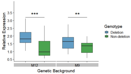 To test the effect of the 3’ UTR deletion on MtnA expression in a common genetic background, we generated nearly-isogenic lines homozygous for the deletion or non-deletion alleles within the genetic backgrounds of two isofemale lines from Munich, Germany (designated as M9 and M12). Expression was measured in male heads by quantitative reverse transcription PCR (qRT-PCR). Within each of these backgrounds, the deletion lines had significantly higher MtnA expression than the non-deletion lines, as shown in Figure 2. The difference in expression was greater in the M12 background (1.85-fold) than in the M9 background (1.20-fold), which might be attributable to variation at other loci segregating between these two backgrounds. However, we did not detect a significant interaction between background and genotype in our analysis (two-factor ANOVA, P = 0.29).
