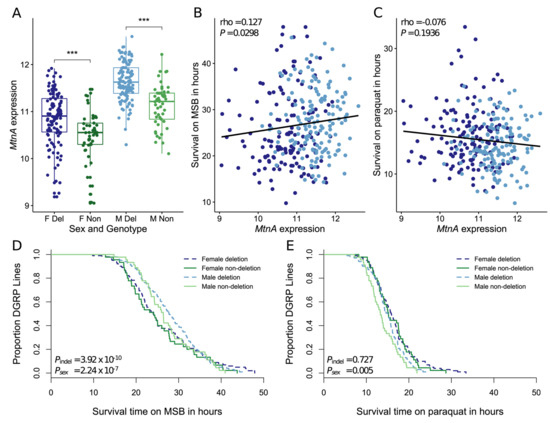 It was previously shown that the MtnA 3’ UTR deletion was associated with increased oxidative stress tolerance in isofemale lines from Europe and Asia [18]. To test for an association in the DGRP lines, we used data from Weber et al. [45], who measured survival on two oxidative stress-inducing agents (paraquat and MSB). MtnA expression was significantly correlated with survival on MSB, as shown in Figure 3B, but not paraquat, as shown in Figure 3C. Additionally, the presence of the deletion was significantly associated with longer survival on MSB, as shown in Figure 3D, but not paraquat, as shown in Figure 3E. Thus, increased MtnA expression and the presence of the 3’ UTR deletion, which is associated with increased MtnA expression, are both associated with increased tolerance to oxidative stress induced by MSB but not paraquat. Consistent with the male-biased expression of MtnA, sex had a highly significant effect on survival on MSB, with males surviving longer than females, as shown in Figure 3D.