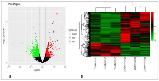 Volcano plot and cluster analysis of differentially expressed genes (DEGs). (a) Volcano plot. Red dots (UP) represent significantly up-regulated genes (log2 FC ≥ 0.58, p < 0.05); green dots (DOWN) represent significantly down-regulated genes (log2 FC ≤ −0.58, p < 0.05); black dots (NO) represent DEGs below the level of significance; (b) based on 1461 known DEGs in the AF tissue of the ovariectomized and sham-operated groups at 14 weeks post-surgery, cluster analysis was performed. The results show that the data in the gene expression profiling of chickens in same group were closely related.