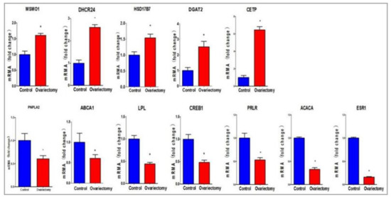 Real-time quantitative polymerase chain reaction (qRT-PCR) verification of DEGs detected by gene expression profiling. The expression levels of DEGs related to lipid metabolism determined by qRT-PCR in the ovariectomized and sham-operated groups. These genes were involved in glycerolipid metabolism, sterol biosynthesis, and fatty acid biosynthesis, among others. Each of these DEGs were up-regulated or down-regulated significantly (p < 0.05) in the ovariectomized group compared with the sham-operated group.