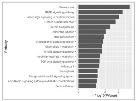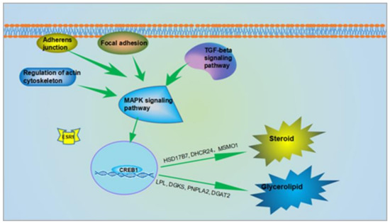 Based on 1461 known DEGs, a KEGG pathway analysis was performed and 17 pathways were found to be significantly enriched (p < 0.05) (Figure 5). As expected, some pathways related to lipid metabolism were screened (e.g., glycerolipid metabolism, steroid biosynthesis, TGF-signaling pathway, MAPK signaling pathways, etc.). In addition, some cell adhesion signaling pathways (focal adhesion, adherens junction and regulation of actin cytoskeleton) were also significantly enriched (p < 0.05).