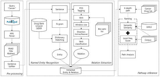 Figure 1). Most cancer drugs target specific paths, which are composed of protein interactions. We therefore established proteins as our middle node. The first component is pre-processing, including parsing XML records that were downloaded manually from the PubMed search engine. During the parsing of records, we extracted important metadata such as PMID, title, and abstract. Once parsing was done, an abstract of the record was split into sentences by a sentence boundary detection algorithm; we used the algorithm provided in Stanford CoreNLP [