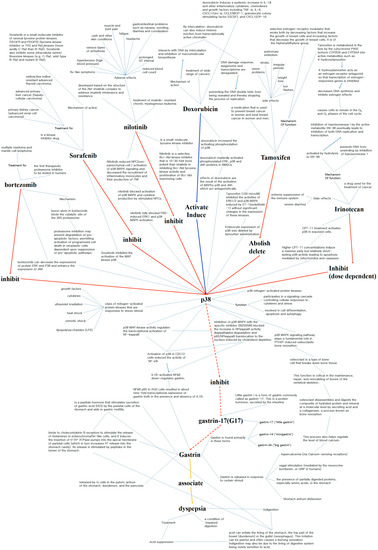 In short, we suggest dyspepsia as a side effect for sorafenib: sorafenib inhibits p38, thereby inducinggastrin, which results in dyspepsia. Through our method, we suggest a mechanism for how sorafenib can cause dyspepsia. For other analyses of type 2 and 3 paths, refer to the