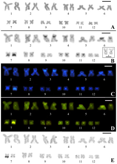 - Sumner, A.T. A simple technique for demonstrating centromeric heterochromatin. Exp. Cell Res. 1972, 75, 304–306. [Google Scholar] [CrossRef]