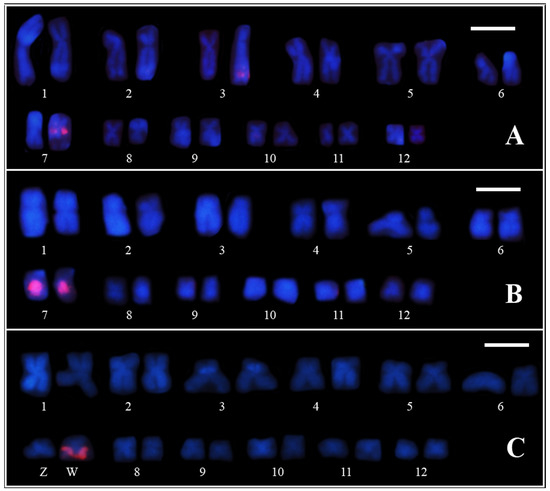 - Busin, C.S.; Andrade, G.V.; Bertoldo, J.; Del Grande, M.L.; Uetanabaro, M.; Recco-Pimentel, S.M. Cytogenetic analysis of four species of Pseudis (Anura, Hylidae), with the description of ZZ/ZW sex chromosomes in P. tocantins. Genetica 2008, 133, 119–127. [Google Scholar] [CrossRef]