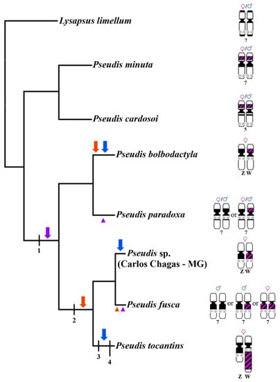 - Busin, C.S.; Vinciprova, G.; Recco-Pimentel, S.M. Chromosomal rearrangements as the source of variation in the number of chromosomes in Pseudis (Amphibia, Anura). Genetica 2001, 110, 131–141. [Google Scholar] [CrossRef]