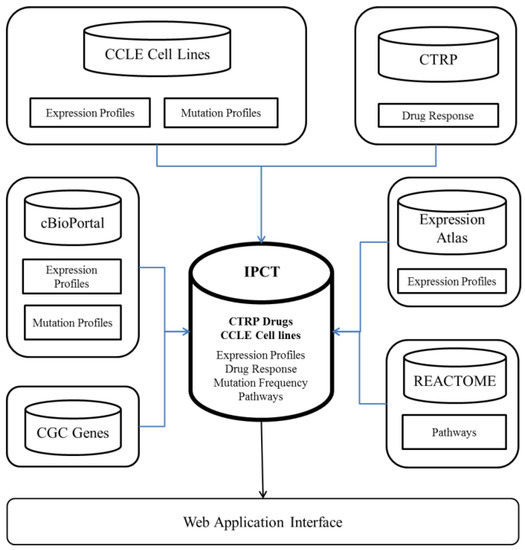 The IPCT is a biological database that integrates data about cancer cell lines, small molecules, human pathways, experimental results, and cancer somatic mutations. Figure 1 and Figure 2 show the architecture of the IPCT database and demonstrate how multiple databases have been integrated in the IPCT database. We collected the cell line data from the CCLE dataset, the small molecule features from the CTRP dataset, the pathway data from REACTOME, the expression data from the Expression Atlas, the list of cancer genes from cancer genes census [] and OncoKB [], and the genomic features of cancer studies from cBioPortal. Our objective was to create an integrated database by connecting the data points in the above databases.