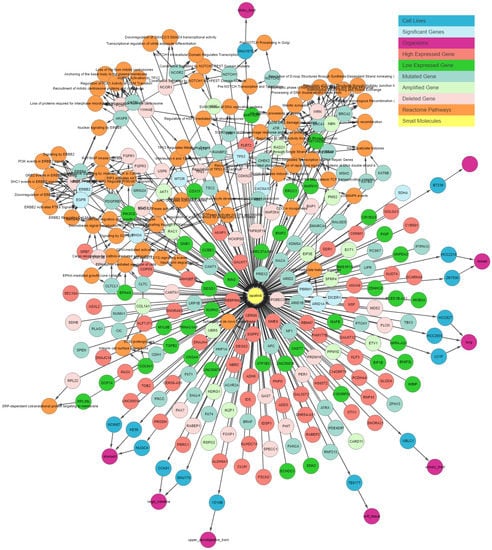 Once we had identified the mutated genes, we added the pathways of the mutated genes to our small molecule–cell line–gene network, collecting pathway data from the REACTOME database. These pathways were connected using Entrez GeneIDs present in both databases.