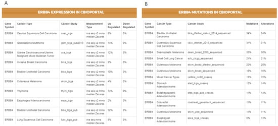 ERBB4’s genetic profile in real tumors extracted from cBioPortal. (A) ERBB4’s differential expression in different cancer studies. (B) ERBB4’s mutation and copy number alteration frequency in different cancer studies.
