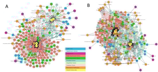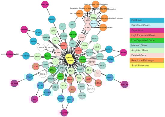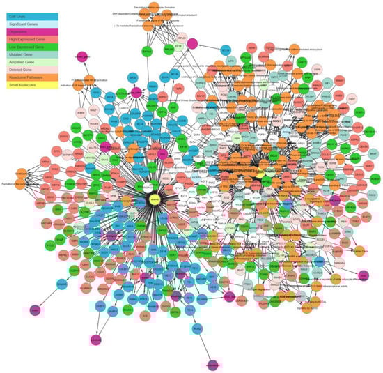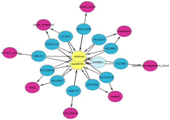 Lapatinib and afatinib are two tyrosine kinase inhibitors that are effective in breast cancer. These drugs are usually effective in HER2 (ERBB2) mutation-positive patients [,]. In this section, we demonstrate how the IPCT can be used to identify the mechanism of action of these two kinase inhibitors. For this purpose, in the first stage, we query lapatinib and afatinib in the IPCT. Figure 6 shows the graph containing the sensitive cell lines, associated genes, and their pathways generated by the IPCT as result of the query, without applying any filter. Genes associated with these drugs are colored and shaped based on their relationship; each color and shape represent a unique relationship between the genes and the cell lines sensitive to the input drug. As such, genes with certain colors and shapes can be classified as more important than other genes.