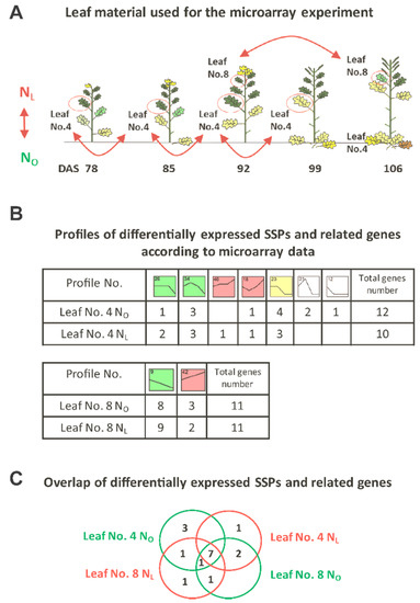 The plant material of Brassica napus cv. Mozart, which was used for transcriptome analyses, the design of the B. napus custom microarray, the identification of Arabidopsis thaliana homologues of the B. napus unigenes, and the basic data analysis workflow are described in Safavi-Rizi et al. [19]. In this experiment, oilseed rape plants were grown under two different nitrogen regimes, optimal (NO) and low (NL) nitrogen. The lower canopy leaf No. 4 was harvested at 78, 85, 92, and 99 days after sowing (DAS) and the upper canopy leaf No. 8 at 92 and 106 DAS (Figure 1A). Physiological analysis with respect to carbon and N-dependent effects as well as detailed description of growth conditions were published in Franzaring, Weller, Schmid and Fangmeier [20] and Franzaring, Gensheimer, Weller, Schmid and Fangmeier [21]. Briefly, expression data analysis was conducted in R [26] with the Linear Model for Microarray and RNA-Seq Data (LIMMA) package [27] applying the standard time-course experiment workflow. Contrast matrixes were built within one treatment with a p-value cut-off 0.05 (Benjamini Hochberg correction) and log2 fold-change cut-off of 1. B. napus genes were annotated by their most similar A. thaliana orthologue, identified by local BLAST+ (version 2.2.30 +, build Aug 28 2015 11:17:27, [28]) against the TAIR-10-Database [29]. Blast results with an e-value > 10−3 were excluded from further analysis. Finally, all transcripts associated with SSPs were extracted by matching AGI identifiers to a list of identifiers of SSP associated genes (for listings see Supplementary Materials Table S3).