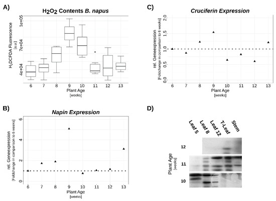 OSR developmental series. Exemplary plants grown in the green house under stable conditions are shown at the top, numbers indicate weeks after sowing. (A) H2O2 contents in leaf No. 8. (B) and (C) relative gene-expression of NAPIN and CRUCIFERIN, respectively, analyzed by qRT-PCR. Expression was normalized to ACTIN2 and expressed relative to value at 6 weeks. (D) Western-blot of the corresponding plant material immune-detected with anti-NAPIN antiserum. Analyzed proteins are samples of 3–5 biological replicates pooled in equal amounts. Leaves are numbered according to their appearance; terminal leaf (T-leaf) is the leaf residing directly below the first developing pods. H2O2 data are medians +/−1.5xIQR of at least 3 biological and 2 technical replicates each. Gene expression data are means of 3 technical replicates from pools of at least 3 biological replicates.