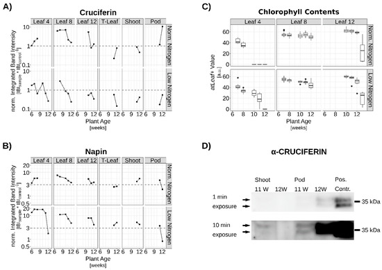 To confirm the protein expression also under controlled N conditions as described in references [19,20], leaf positions 4, 8 and 12, the terminal leaf as well as shoot tissue and siliques were harvested of another growth series. Chlorophyll contents were measured via atLeaf+. Leaf No.4, the lowest leaf position analyzed, remained on the plant only until week 8 under NO conditions, whereas under NL conditions this leaf was shed between week 11 and 12. Longer maintenance of photosynthetic capacities, especially of lower canopy leaves, enhanced assimilate supply to the pods as well as the roots [22]. The higher canopy leaves exhibited a slightly higher Chl-content under higher N-supply.
