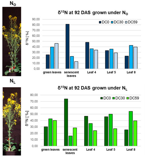 The idea of an interim N-storage is also supported by the follow-up of 15N-labeled nitrogen over time in parallel to the expression profiling [21]. 15N-labeled fertilizer was supplied at three different time points, directly after sowing (DC 0), 72 DAS (DC 30), and 80 DAS (DC 59). Nitrogen recovery and the distribution of the labeled N to different organs was measured by isotope ratio mass spectrometry [21]. Here, we present the δ15N mean values for pooled green and senescent leaves as well as for the individual leaves No. 4, 5 and 8 at harvest 4 (92 DAS). Exactly the same leaf material was also used for expression profiling (No. 4 and 8; [19]) and hydrogen peroxide measurements (No. 5; [11]). At this time point, early supplied nitrogen (DC 0) appeared to be inefficiently remobilized and mainly rested in the older leaves (No. 4 and 5) while the highest proportion was shed in senescent leaves. In contrast, nitrogen originating from the second and third N gift (DC 30 and DC 59) accumulated less in shed senescent leaves but more in the younger leaf No.8. This can be observed under both N-supplies in which the effect is most prominent under NL and DC 30 labelling (Figure 4). This might indicate that N taken up at flowering time appears to be stored temporarily in the younger leaves most likely to be further remobilized to the developing seeds after anthesis. Possibly, also stems and pods contribute to this interim storage, as total N in stem and pods declined while total N in seeds increased (Supplementary Materials Figure S3).