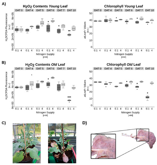 Nitrogen (N) starvation induced senescence in Brassica napus. (A) and (B) Hydrogen peroxide (H2O2) and chlorophyll contents in young leaves (A) and in old leaves (B). (C) Plant grown under full N-supply (left) and under N-starvation (right). (D) Exemplary anthocyanin accumulation pattern in N-starved plants. Statistics: Welch’s t-test. Significance levels: p < 0.001 = ***; p < 0.01 = **; p < 0.05 = *. Data are medians +/−1.5xIQR of at least 3 biological and 2 technical replicates each.