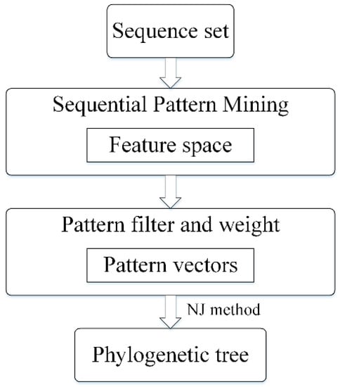 To overcome mentioned issues, we propose a sequential pattern mining based method to construct phylogenetic tree, which is especially pronounced for highly divergent sequences. As shown in Figure 1, we first extract frequent sequential patterns with position information and measure the distance among all sequences based on the extracted patterns. Using the feature space formed by these patterns, the sequence sets can be converted into a pattern vector sets. Then a phylogenetic tree can be built based on these vectors. Our method cannot only mine exact match patterns but also fuzzy matching, such as fuzzy pattern AxT contains a wildcard x [18]. Besides fuzzy matching, we add weight to each pattern and filter redundant patterns to achieve a high-quality feature space. Experiments on simulated and real data, our method is proved to be reliable and outperformed towards other methods.