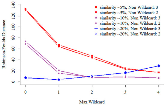 Performance comparison with different non-wildcard and max-wildcard settings on sequences of different similarities. Test results on 200 simulated protein sequences of length 350 amino acid (aa). For different relatedness sequences, all support of the sequential pattern mining is 0.03. For a fixed non-wildcard, we generated patterns of max-wildcard between 0 and 4, i.e., with 2 non-wildcard and up to 4 max-wildcards. The vertical coordinate represents the distance of phylogenetic trees.