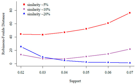 In data mining, the term “Support” means the number of sequences contain a specific pattern. In general, as the support increases, the number of patterns used to construct the feature space decrease. As shown in Figure 3, for similar sequences (relatedness value is 250, similarity is about 20%), the distance between phylogenetic tree built by our approach and reference tree becomes smaller as the minimal support value increases. For divergent sequences (relatedness value is 450, similarity is about 5%), we observe opposite result. Thus, we recommend support should be set according to the sequence similarity.
