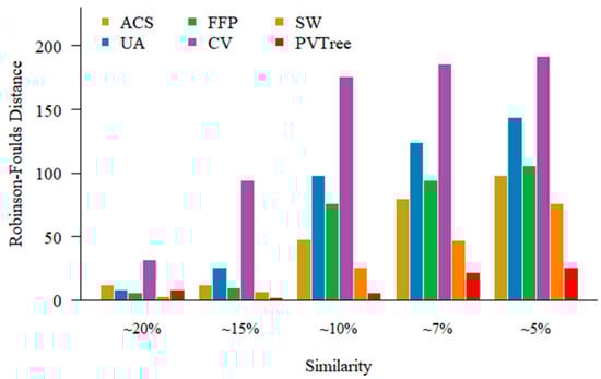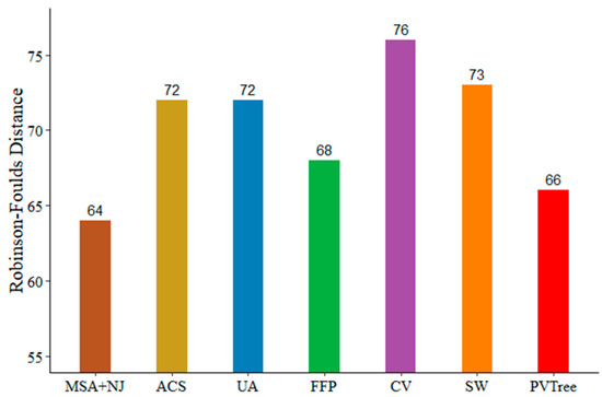 - Robinson, D.F.; Foulds, L.R. Comparison of phylogenetic trees. Math. Biosci. 1981, 53, 131–147. [Google Scholar] [CrossRef]