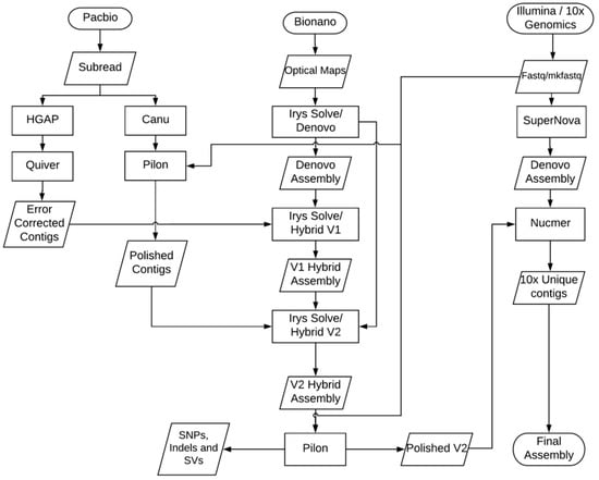 - Shelton, J.M.; Coleman, M.C.; Herndon, N.; Lu, N.; Lam, E.T.; Anantharaman, T.; Sheth, P.; Brown, S.J. Tools and pipelines for bionano data: Molecule assembly pipeline and fasta super scaffolding tool. BMC Genom. 2015, 16, 734. [Google Scholar] [CrossRef]