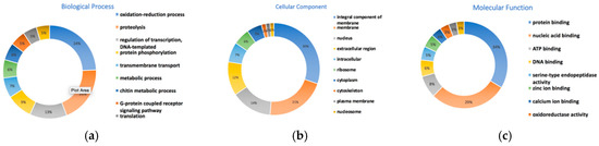 To perform functional analysis of the predicted genes, we ran an InterPro [47] search against the InterPro consortium databases including Pfam, PROSITE, TIGRFAMs, CDD and 10 other databases based on homology searches. The InterPro search resulted in 13,143 protein coding genes (93.2% of total). Protein sequences were classified into families and assigned domains or functional sites. Among the 13,143 protein sequences, 8680 (66%) protein sequences were assigned Gene ontology (GO) terms, and 10,846 (82.5%) had a Pfam domain assignment. The GO terms were summarized into three main GO categories-biological processes, cellular components and molecular functions. We found a total of 884 biological processes, 316 cellular components and 952 molecular functions for the predicted gene models in the Tni-FNL genome (Table S3). The most abundant (top 10) subcategory genes are selected and shown in Figure 2.