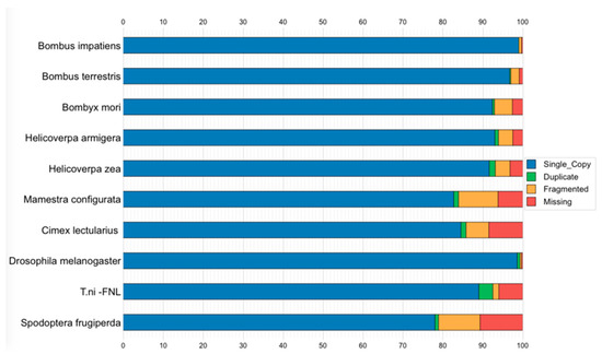 For the ortholog analysis, we searched the OrthoDB6 [48] database using RefSeq genes from 10 genomes, including Tni-FNL (Trichoplusia ni), Spodoptera frugiperda, Bombyx mori, Cimex lectularius, Bombus terrestris, Bombus impatiens, Helicoverpa zea, Helicoverpa armigera, Mamestra configurata, and Drosophila melanogaster. BUSCO [23], a known benchmarking approach for assessing single-copy orthologs conserved among species, was used to annotate the completeness of single-copy orthologs in the above genomes. We found 2175 complete and single-copy orthologs in Trichoplusia ni (89.1%) out of 2442 total orthologs of the Holometabola lineage. This provides further evidence of high accuracy and completeness of our Tni-FNL cell line genome assembly (Figure 4).