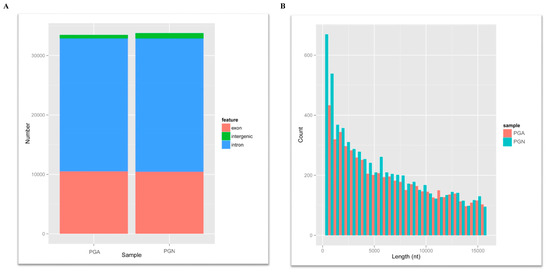 To understand the characteristics, abundance and differences of circRNAs in the pituitary gland during estrus and anestrus in sheep, we used the FindCirc (https://omictools.com/find-circ-tool) calculation pipeline to detect circRNAs using clean data after strict quality control, and the candidate circRNAs with a reads greater than 2 were identified as circRNA [14]. From the RNAseq of the PGA and the PGN, we identified a total of 12,468 circRNAs from these data, and the length of these circRNAs varies from ten to thousands of bases, but mainly concentrates below 10,000 bases (Figure 1A). In addition, we studied the composition of these circRNAs. As a result, the percentage of introns, intergenic regions, and exons that constitute circRNA in PGA were 30.9%, 66.4%, and 2.7%, respectively, while the percentages in PGN were 31.4%, 66.8%, and 1.8%, respectively (Figure 1B). However, that reveals no significant difference in the composition of circRNAs between PGA and PGN but shows a minimal percentage of exons in both states. Analysis of these circRNA sources revealed that these circRNAs were distributed on 26 autosomes and X chromosomes. All circRNAs annotations, chromosomal location, and host mRNAs are shown in Table S2.